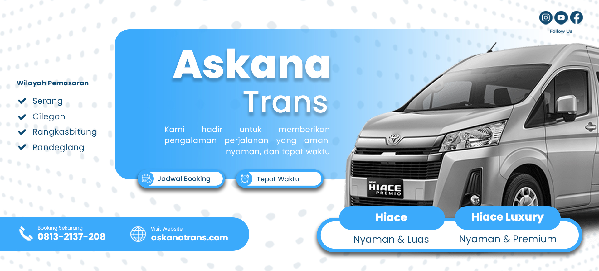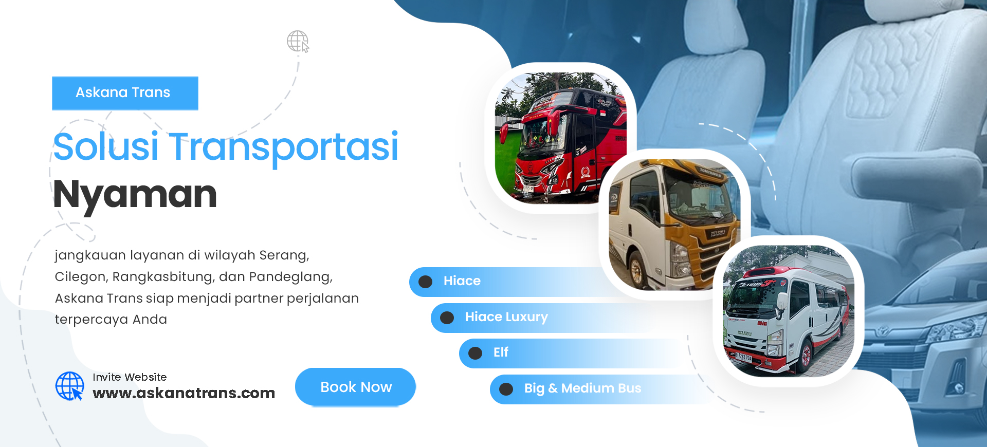 Percayakan perjalanan Anda bersama Askana Trans. Dapatkan layanan terbaik dengan armada berkualitas, bersih, dan terawat, serta didukung oleh driver yang profesional dan berpengalaman di bidangnya.